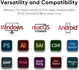 - سازگاری گسترده: این محصول با سیستمعاملهای ویندوز (7 به بالا)، مک (10.10 به بالا)، لینوکس و حتی اندروید (از طریق USB) سازگار است. همچنین از نرمافزارهای محبوبی مثل Adobe Photoshop، Illustrator، Corel Painter، Clip Studio و Krita پشتیبانی میکند.