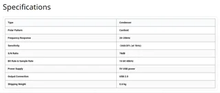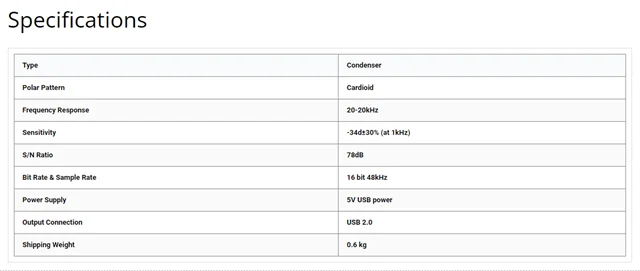 الگوی قطبی کاردیود این میکروفون، تمرکز دریافت صدا از قسمت مقابل میکروفون را دارد و نویزهای پشت میکروفون به حداقل رسانده میشود تا صدایی واضح و شفاف داشته باشید. پاسخ فرکانسی آن از 20 هرتز الی 20000 هرتز است و حداکثر فشار صوتی 130 دسی بل را میتواند تحمل کند. دارای حساسیت بالایی بوده و برای استفاده در پادکست، چت تصویری و استریمینگ و غیره مناسب است.