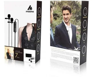 درون جعبه این محصول یک عدد میکروفون MAONO AU-200 با دو سر کاندنسور، دو عدد باتری (یکی اضافه برای زاپاس)، یک عدد آداپتور، دو گیره فلزی، دو ضد باد، و یک دفترچه راهنما قرار دارد.