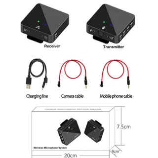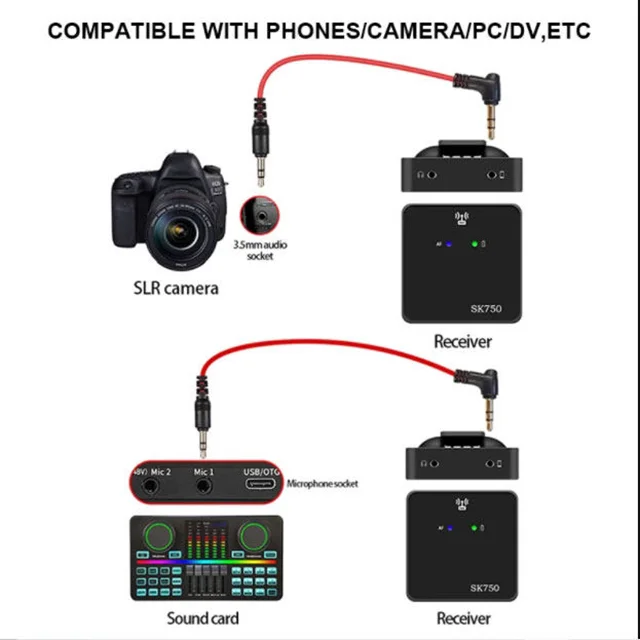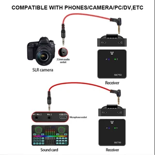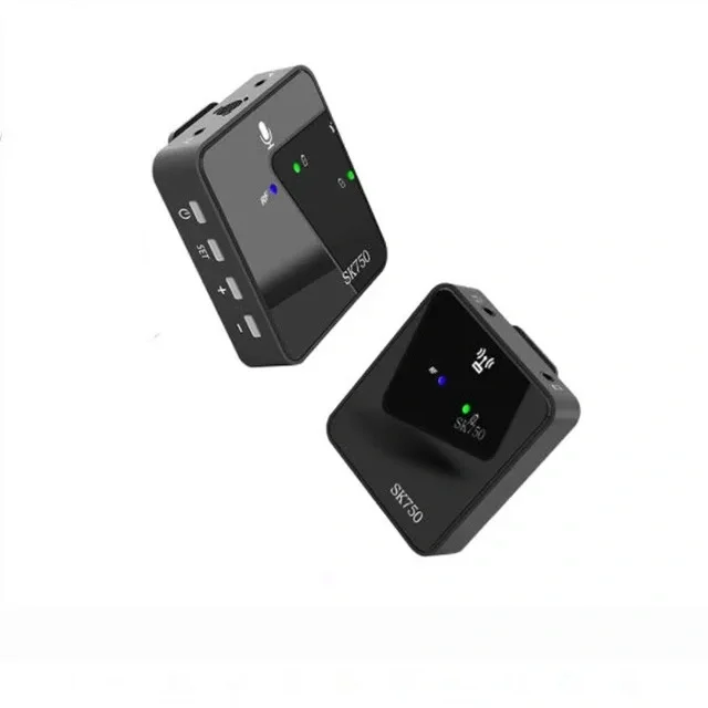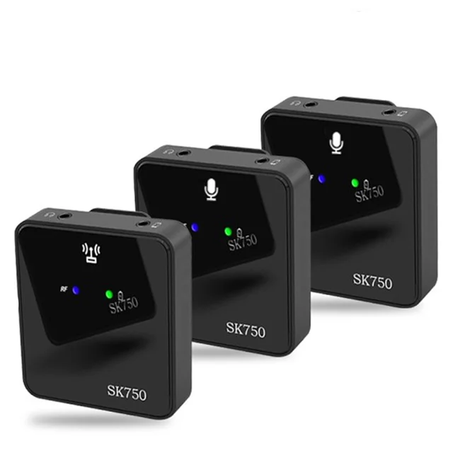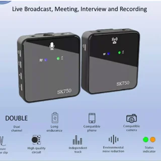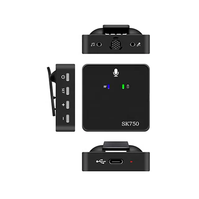 میکروفون بی سیم wireless sk750 تک کاناله فرستنده را با استفاده از گیره میتوان به یقه متصل کرد. گیرنده نیز امکان اتصال به موبایل و دوربین را دارد. الگوی قطبی omni-directional میکروفون، صدا را همه جانبه و 360 درجه از اطراف دریافت میکند. این میکروفون دارای باتری داخلی بوده و توسط کابل دو سر type c، به کمک آداپتور شارژ و پاور بانک شارژ میشود. این میکروفون برای گوشیهای آیفون و اندروید با پورت type c، قابل استفاده است. فرستنده این مدل به کمک یک عدد دکمه Power روشن و خاموش میشود. جهت روشن کردن این دستگاه باید به مدت 3 ثانیه دکمه Power را نگه داشته تا نشانگر روی فرستنده آبی شود. روی دستگاه نیز یک نشانگر جهت نمایش میزان شارژ فرستنده وجود دارد که در صورت کامل بودن میزان شارژ، رنگ آن سبز میشود. در وجه بالای فرستنده میکروفون داخلی دستگاه، یک عدد ورودی صدا جهت پخش صوت و یک ورودی دیگر برای اتصال میکروفونهای خارجی قرار دارد. به کمک دکمههای Vol میتوانید میزان صدا را کم یا زیاد کنید. روی گیرنده نیز مانند فرستنده نشانگر میزان شارژ، نشانگر روشن یا خاموش بودن دستگاه و همچنین دکمه Power قرار دارد. به علاوه یک خروجی هدفون جهت مانیتورینگ صدا و خروجی دیگر برای اتصال گیرنده به دوربین، موبایل و کارت صدا نیز روی آن طراحی شده است.