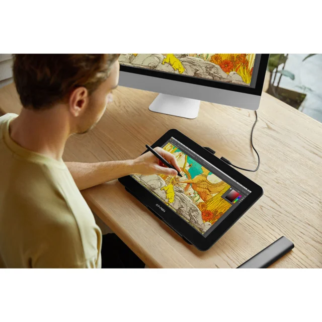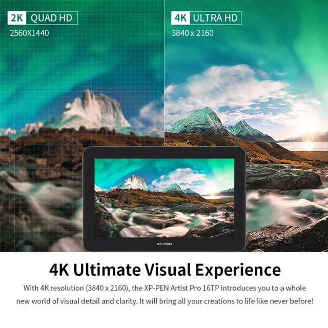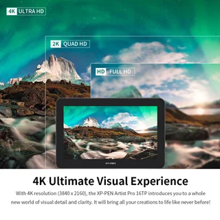 آرتیست پرو 16 تی پی (Artist Pro 16 TP) جدیدترین مدل نسل جدید مانیتورهای قلمی است که با بهره مندی از ویژگیهای خاص و منحصر به فرد فنی، به کلی با نسل قبلی مانیتورهای قلمی متفاوت است. نخستین ویژگی که این مدل را خاص می کند مالتی تاچ Multi Touch بودن پنل آن است و عنوان TP در نام این مدل اشاره به Touch Panel بودن صفحه مانیتور آن است. هنگامی که نوک قلم در مجاورت صفحه مانیتور نباشد ویژگی مالتی تاچ بطور خودکار، فعال می شود و با قرار دادن 2 یا چند انگشت می توان بطور مستقیم از روی صفحه مانیتور، اعمال Zoom In/Out یا چرخش Rotate و یا Navigate را انجام داد. کیفیت تصویری 4K ویژگی دیگر این مدل است که تصاویر روی مانیتور را با بهترین کیفیت و بالاترین وضوح (3840 x 2160) نمایش می دهد. همچنین با 92% Adobe RGB, 124% sRGB, 1000:1 contrast ratio جلوه ای از طبیعی ترین رنگها را در صفحه مانیتور ایجاد می کند. صفحه آن با کاهش زبری سطح شیشه AG ، باریک شدن فاصله ذرات و جلوگیری از پدیده تقویت لنز محدب ، یک تجربه بصری خیره کننده را بدون نقاط دانه دار و تداخل بازتاب معمول در سایر مانیتورهای قلمی ارائه می دهد تا خستگی چشم را بطور مطلوب، رفع کرده و نهایت آزادی در خلاقیت کاربر را تامین کند. قلم PH2 آن دارای یک پاک کن در انتهای قلم است و حساس به فشار تا 8192 مرحله است. این قلم، قادر به تشخیص زاویه شیب قلم تا 60 درجه است که امکان خلق جلوه های ویژه هنری را فراهم می کند. دارای یک جعبه کشویی جا قلمی زیبا و شکیل است که نگهدارنده و محافظ قلم و 9 عدد نوک یدکی همراه آن است. دارای دستکش طراحی است. 2 پورت USB-C داشته و با انواع سیستمهای عامل Windows 7/8/10 و Mac OS X 10.10 (or later) و Chrome OS 88 (or later) وAndroid (USB3.1 DP1.2) سازگار است. دارای طرح بسیار زیبا همراه با ملزومات شکیل و متفاوت با جاقلمی کشویی ویژه و یک بسته بندی خاص و متفاوت است که در جمع، یک محصول خاص و لاکچری با بالاترین کارایی را فراهم نموده است.